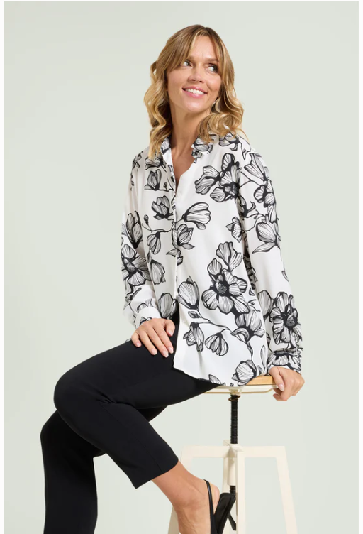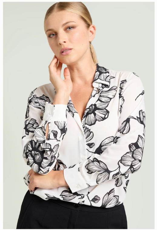 Camicia fantasia in doppia georgette. Linea dritta, colletto con listino, chiusura con bottoni, manica lunga con polso, dietro con carrè doppio e soffietto.