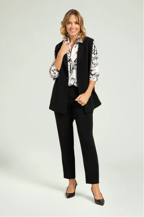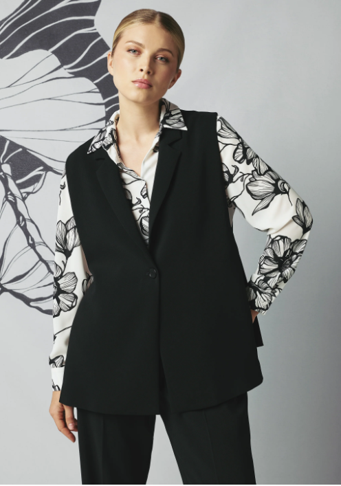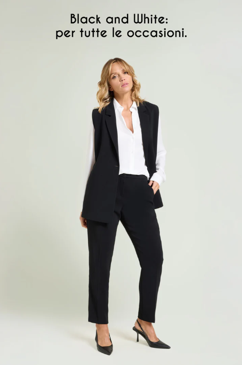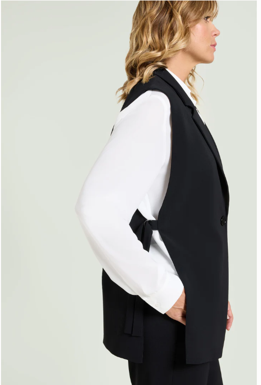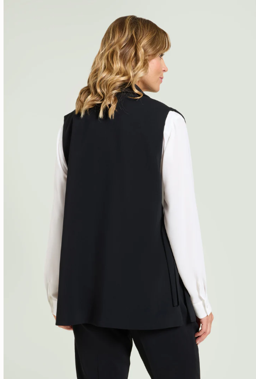 Giacca senza maniche ad effetto gilet in crepe cady. Tessuto stretch four season. Collo e rever, chiusura con un bottone. Alti spacchi laterali chiusi da cinturino regolabile. Abbinabile a pantaloni nello stesso tessuto per creare un tailleur coordinato.