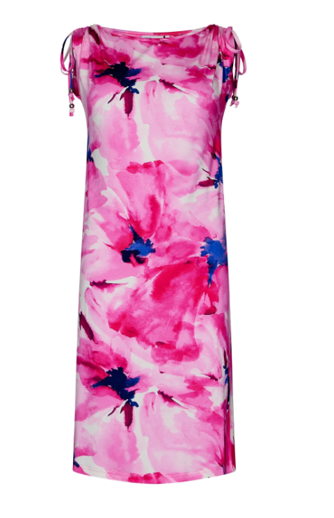 L’abito ha una stampa allover di un motivo floreale grafico in diverse tonalità di rosa e blu, che gli conferisce un aspetto fresco e vibrante. L’abito ha uno scollo rotondo e maniche corte. Un bel dettaglio sono i cordoncini giocosi sulle maniche, con i quali puoi accorciare o allungare le maniche a piacere.