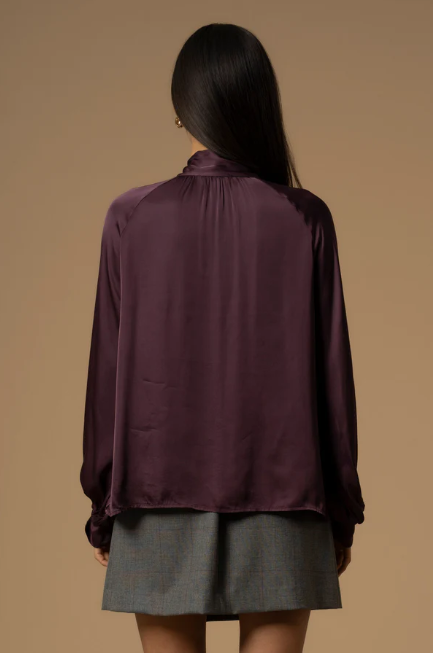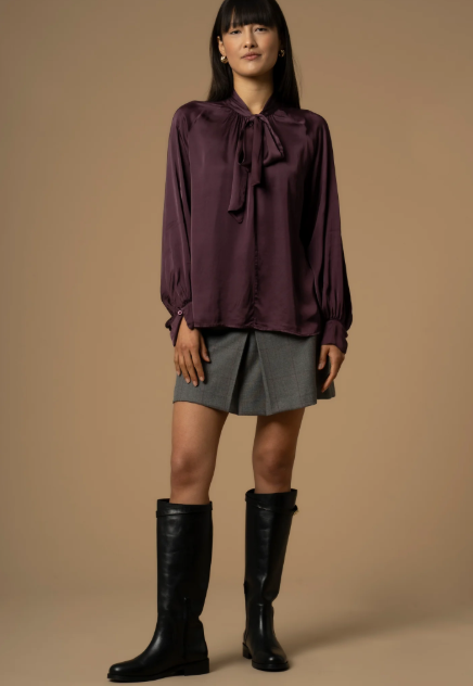 Questa blusa in pura viscosa a maniche lunghe è caratterizzata da una fusciacca da annodare sul collo, maniche con polsino a bottoni, linea ampia e vestibilità regolare.