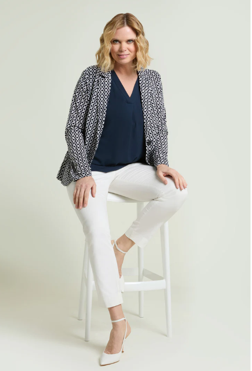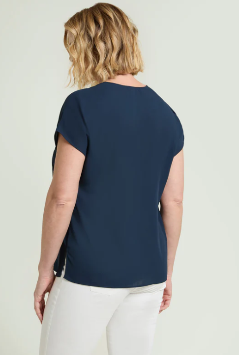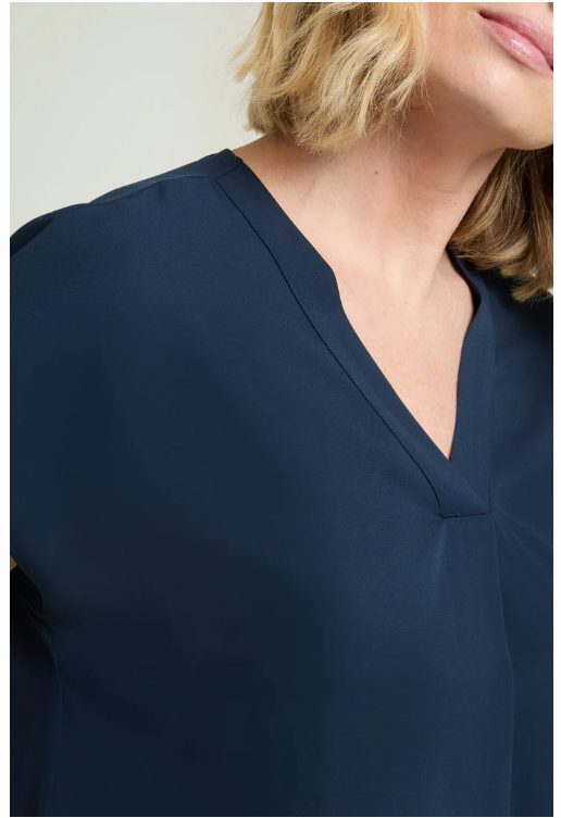 Blusa in doppia georgette, con scollo a V e soffietto su centro davanti. Manica corta chimono, spacchetti laterali.