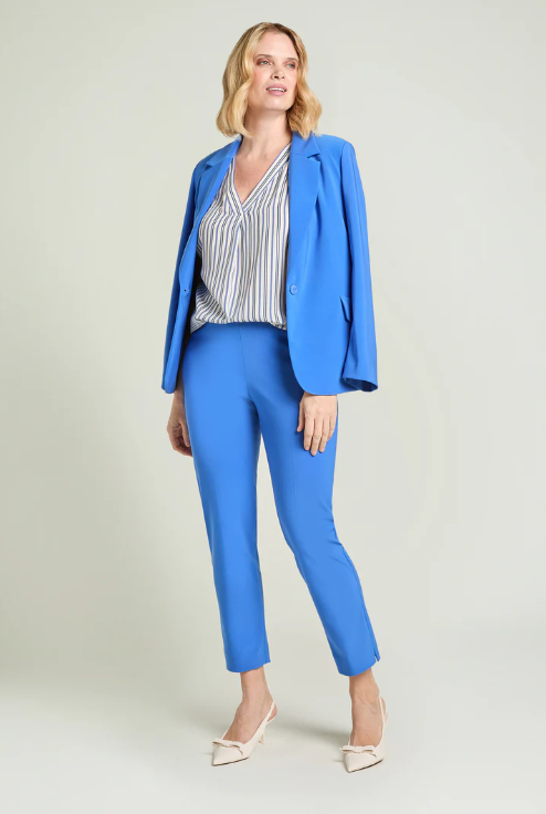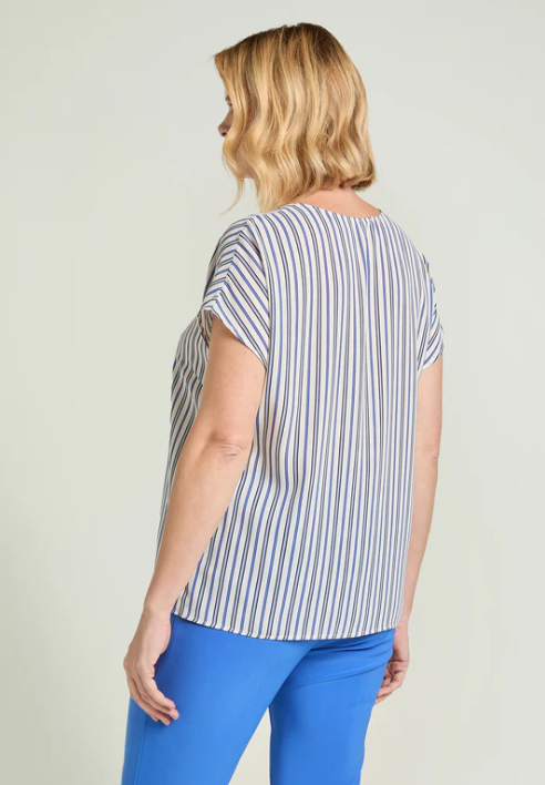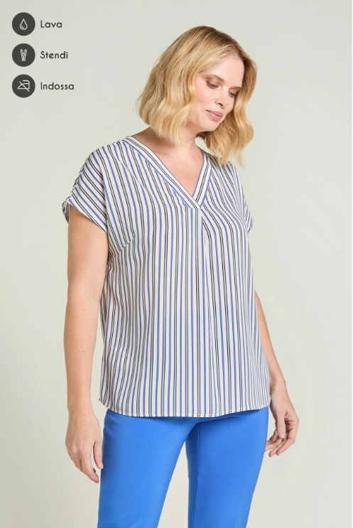 Blusa fantasia in doppia georgette, con fondo bianco seta e gessatura blu e lapislazzulo. Scollo a V con soffietto su centro davanti, manica corta chimono.