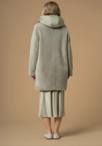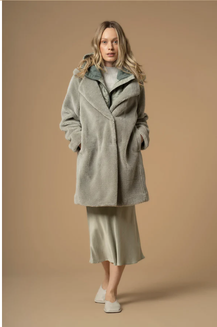 Caldo e avvolgente, questo cappotto teddy coat della capsule Pure Verve presenta ampi revers sullo scollo, chiusura con bottoni nascosti e tasche a filetto laterali.