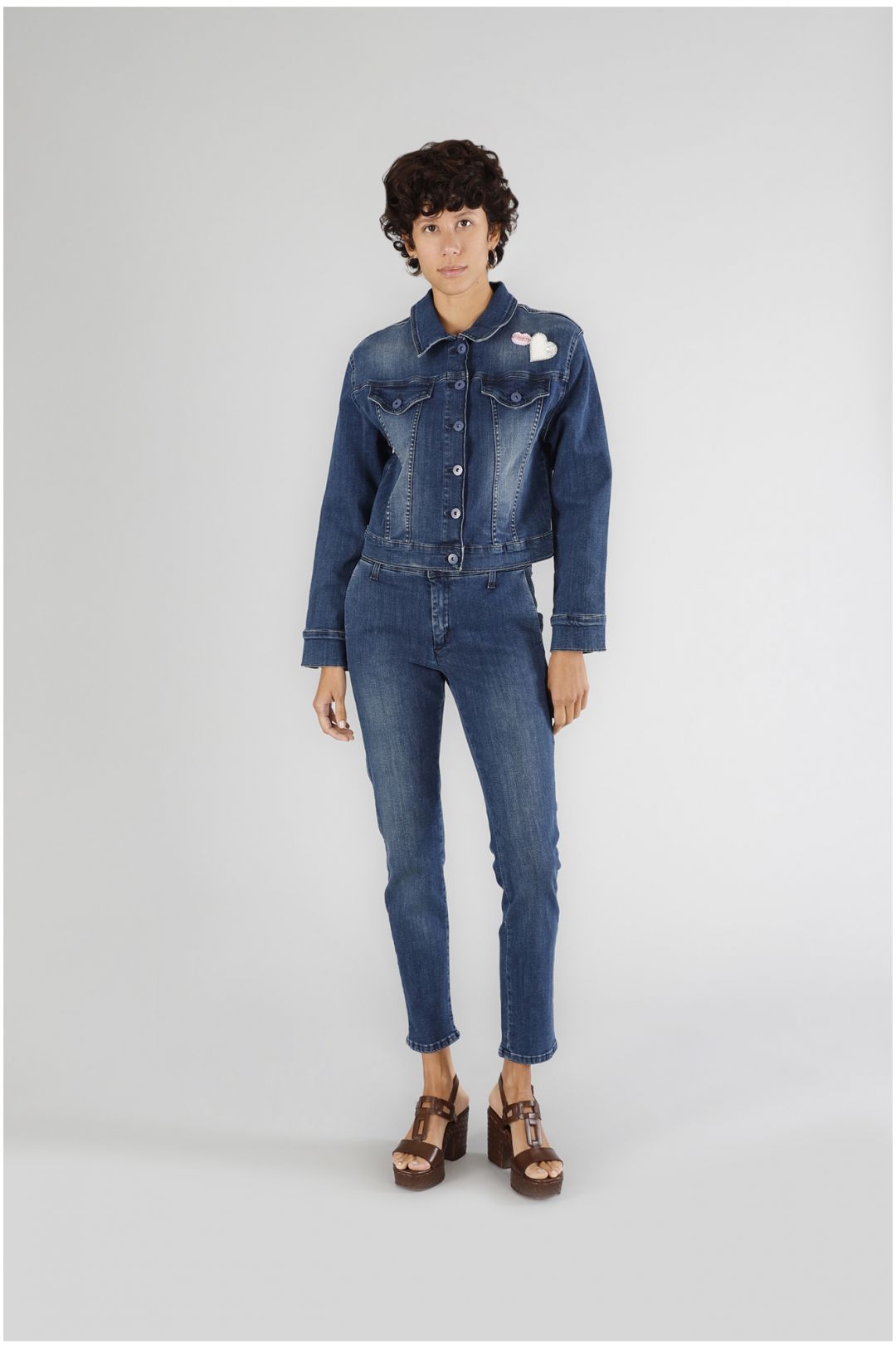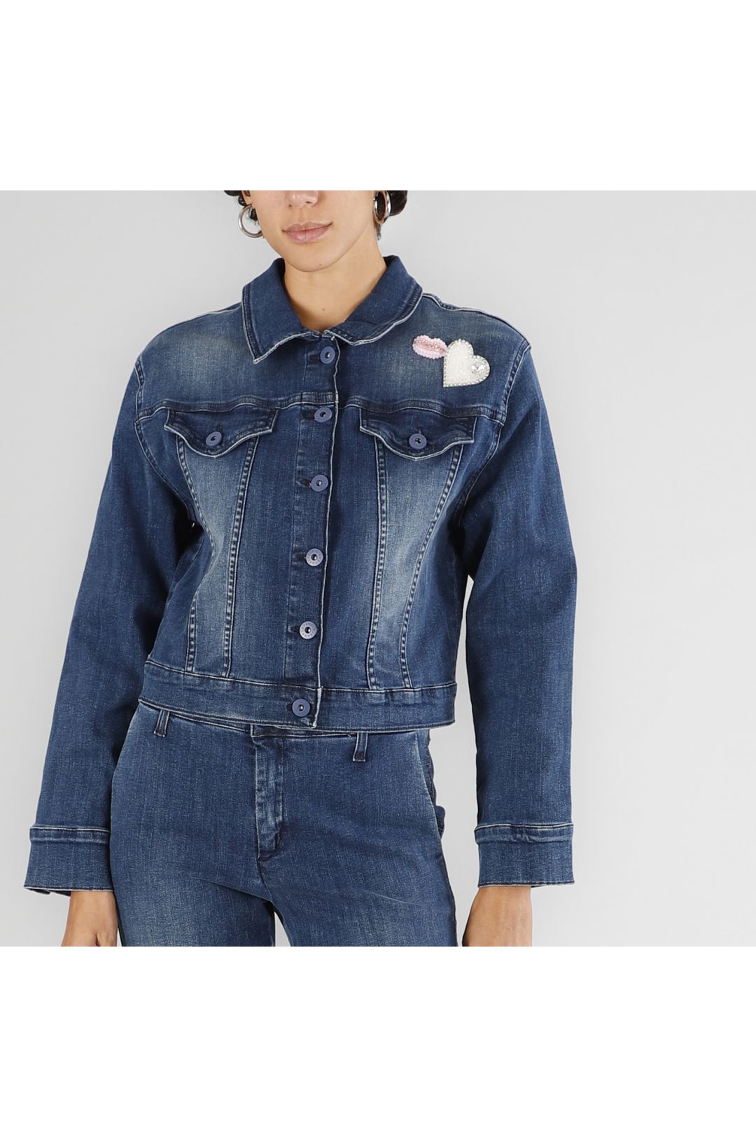 Giubbino denim in tela superstrech. chiusura con bottini e spilla removibile. capo che si adatta ai total look in denim e alle occasioni casual con t-shirt e scarpe basse.