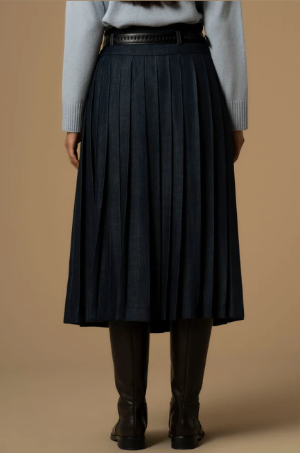 Elegante e raffinata, questa gonna della collezione Pure verve è caratterizzata dal tessuto plissè che regala stile e leggerezza al capo. Il modello presenta uno spacco sul davanti e una fascia alta in vita con cintura con fibbia dorata.