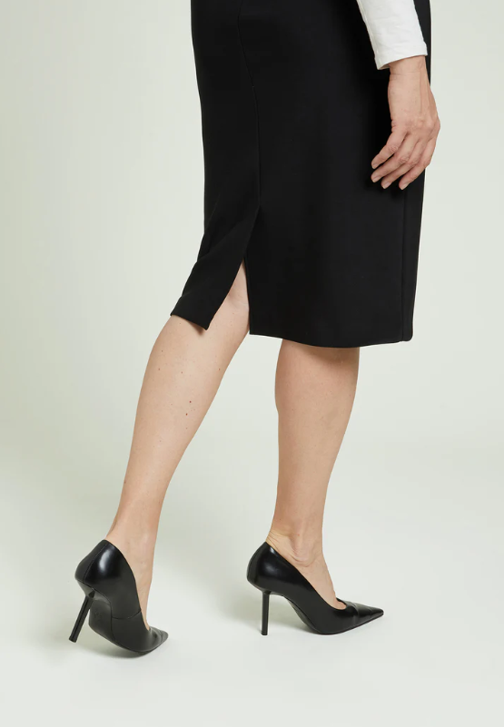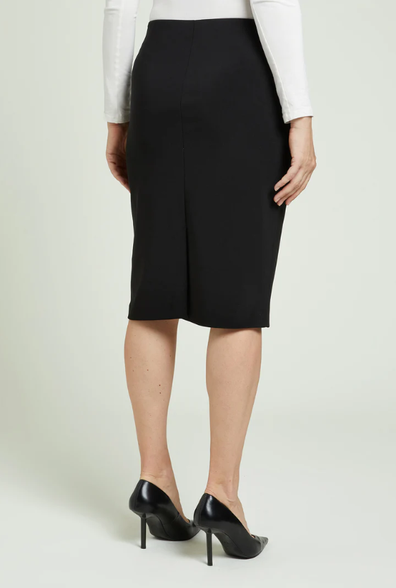 Gonna tubino in compatto stretch “enver satin”, un tessuto caratterizzato da un rovescio raso che dona una piacevole sensazione sulla pelle. Costruzione “Pull-On” senza zip, cintura estensibile con elastico inserito all’interno. Sfoderata, spacco sormontato su centro dietro.