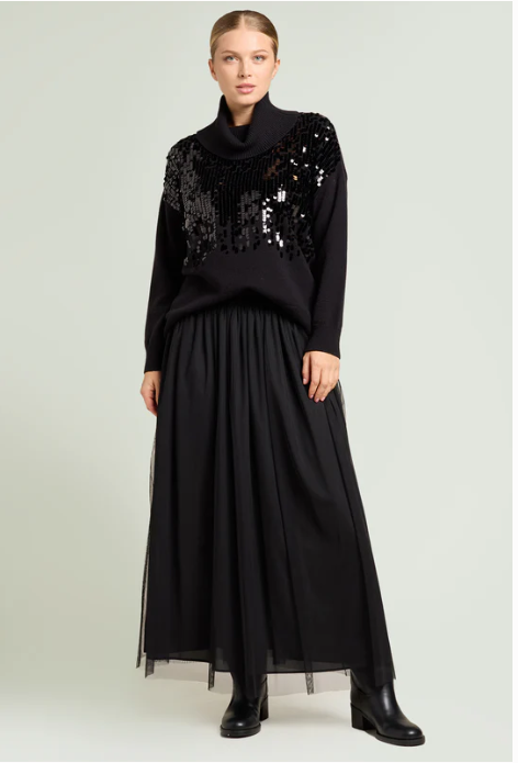 Maglia realizzata in un confortevole filato winter touch. Punto rasato in finezza 7 con bordi in costa, scollo a barchetta con collo ad anello staccabile. Ricamata con maxi-paillettes in tinta.