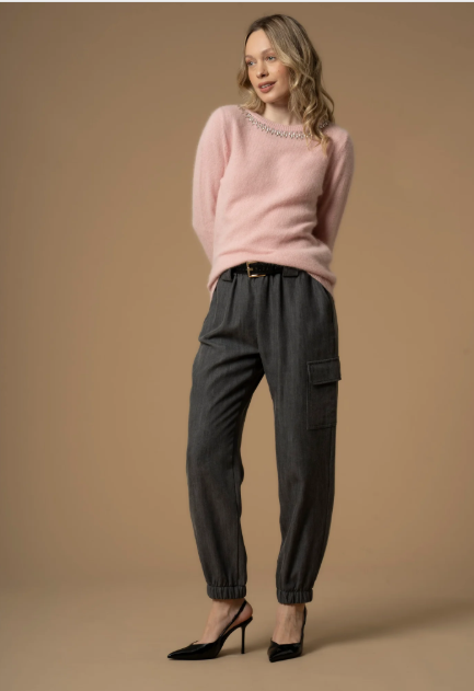 Questa maglia presenta lo scollo impreziosito da un collier in pietre che regala stile e raffinatezza al capo. Il modello presenta taglio dritto, vestibilità regolare e bordi a costine.