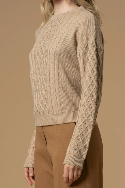Una pioggia di punti luce scintillanti impreziosiscono questa maglia della capsule Pure Verve caratterizzata da una lavorazione a trecce e rombi. Questo capo presenta scollo rotondo, bordi a costine e giromanica sceso.
