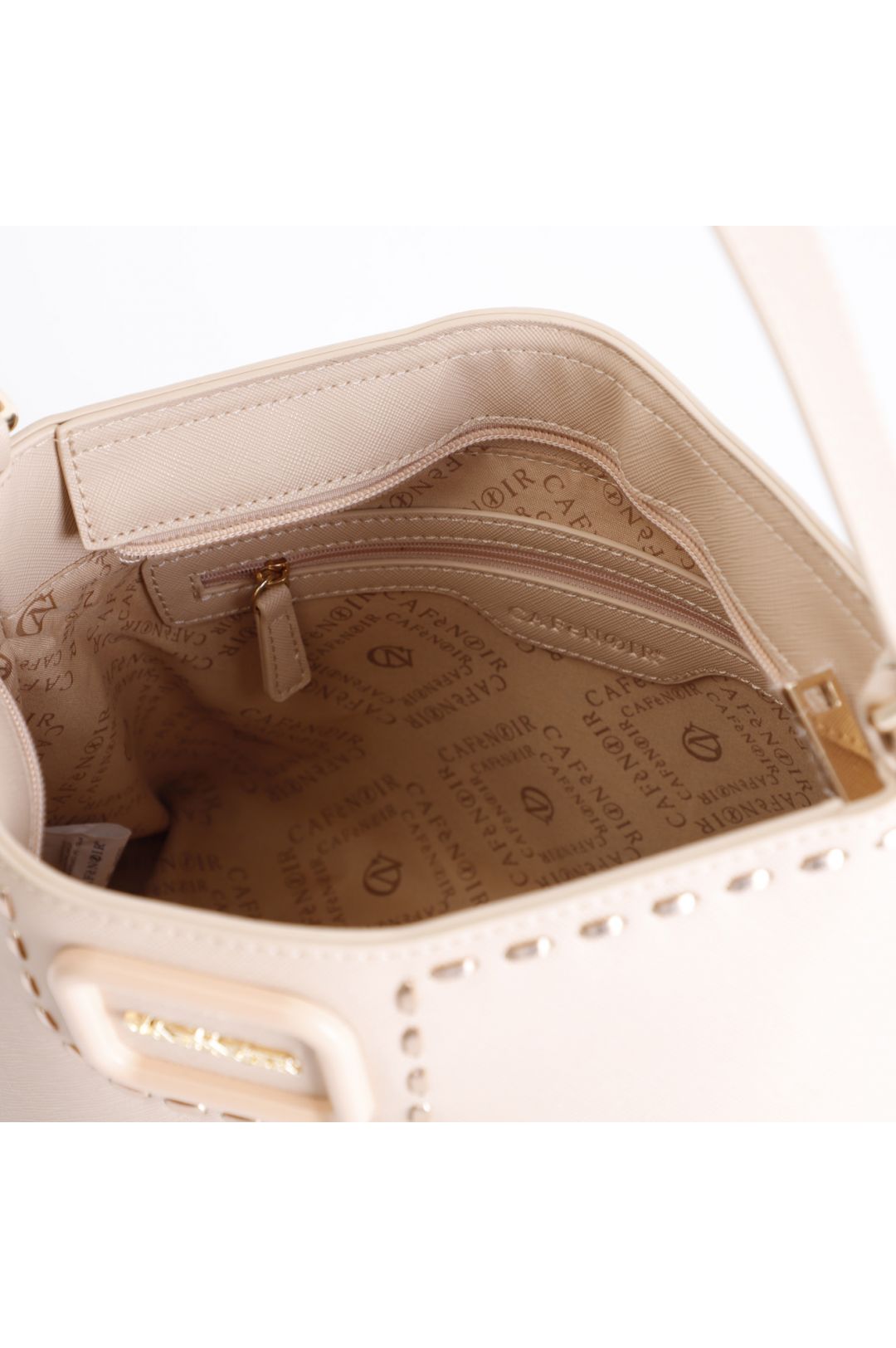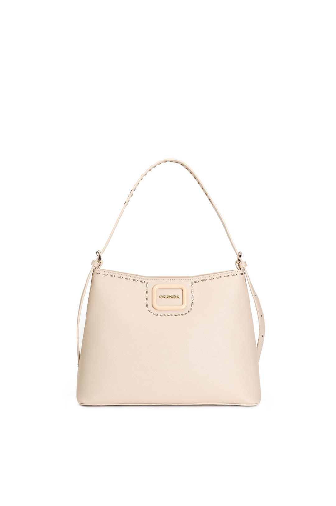 sacca in saffiano con accessorio smaltato e motivo di infilatura metallizzata