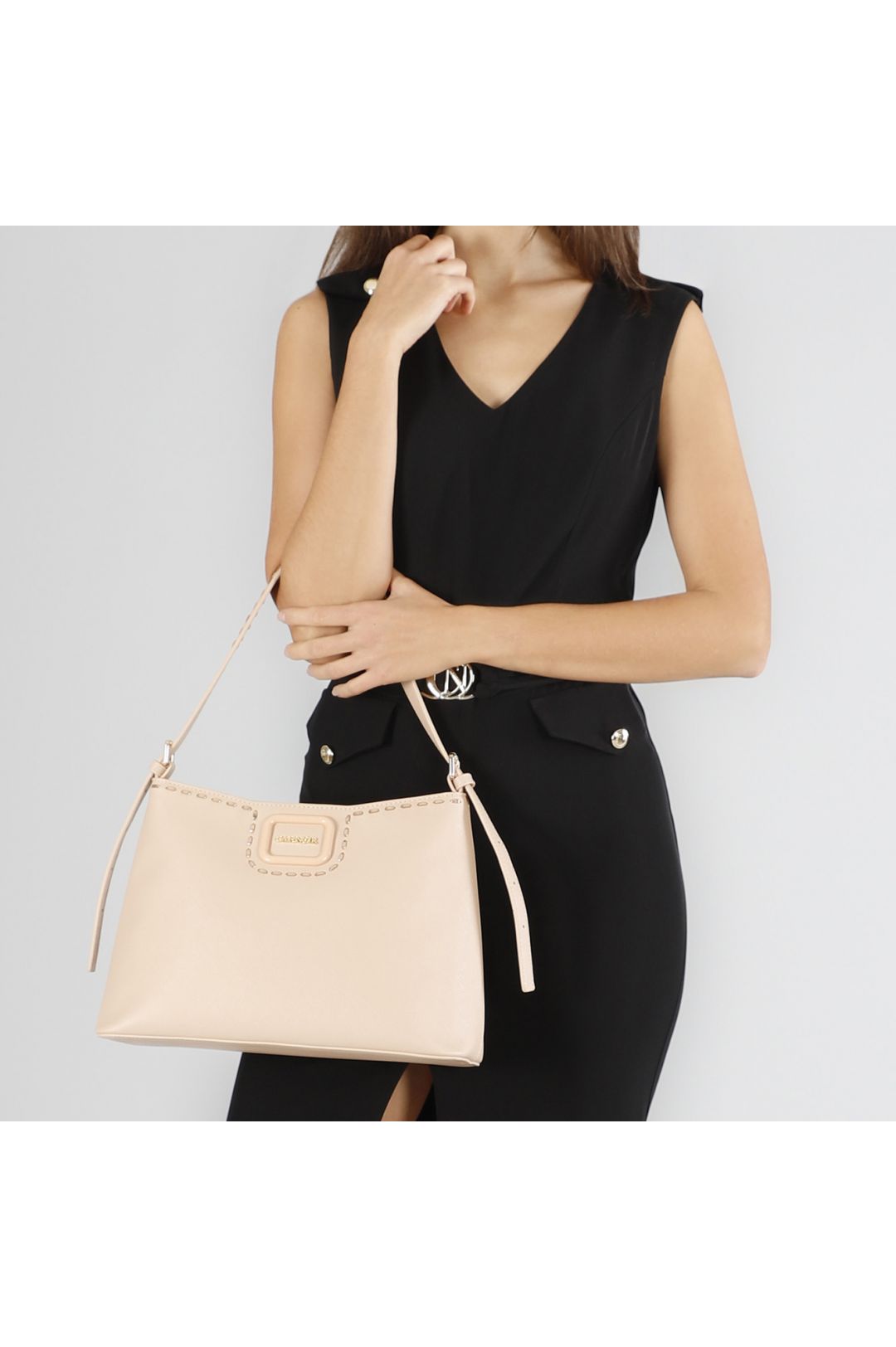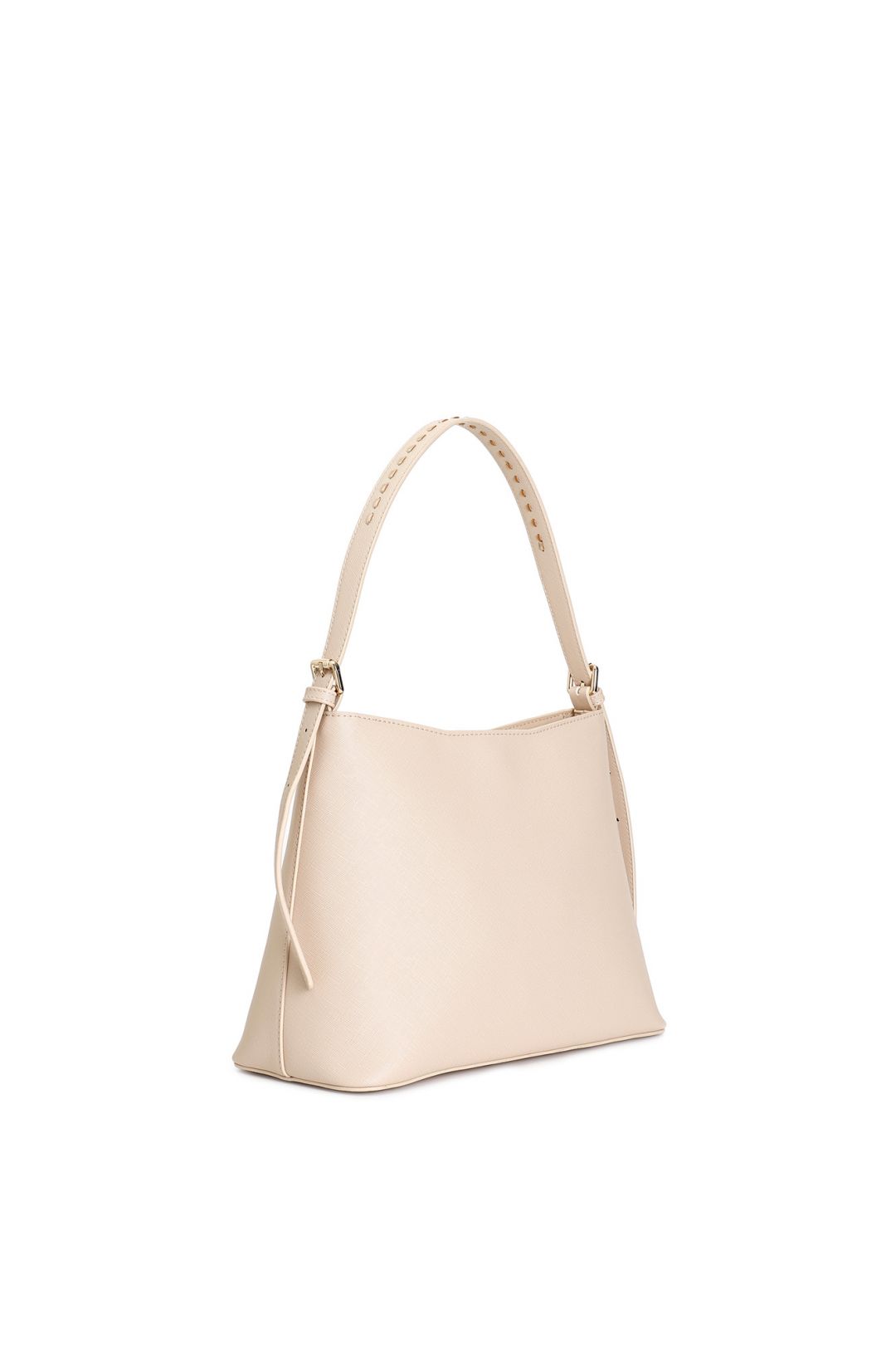 Borsa a spalla in saffiano con accessorio a cornice smaltato tono su tono e dettagli di infilatura metallizzata. tracolla regolabile con motivo intrecciato raffinato.