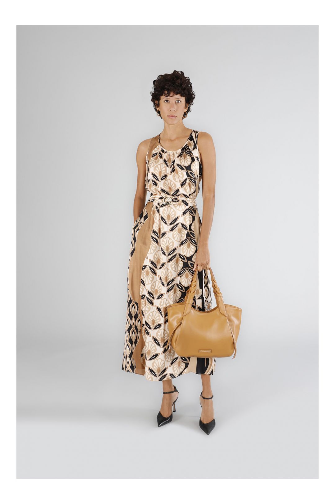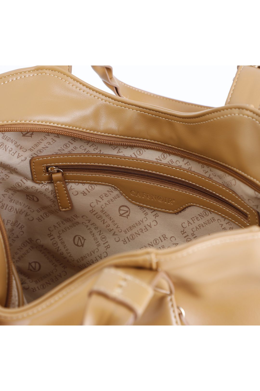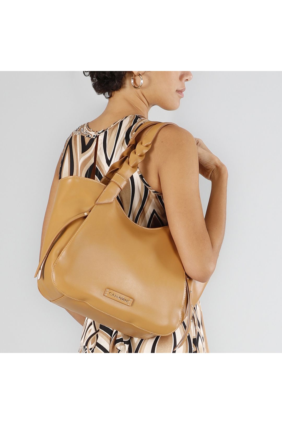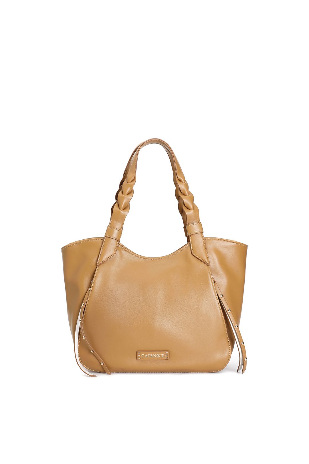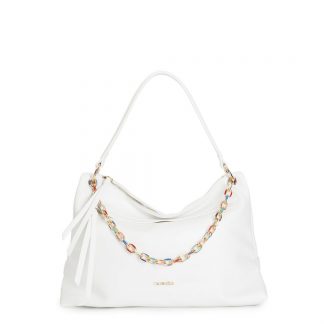 Morbida shopping bag con tasche laterali e tiralampo bicolore decorati con rivetti manici intrecciati e logo su patch in metallo. chiusura con zip per stile e praticità.