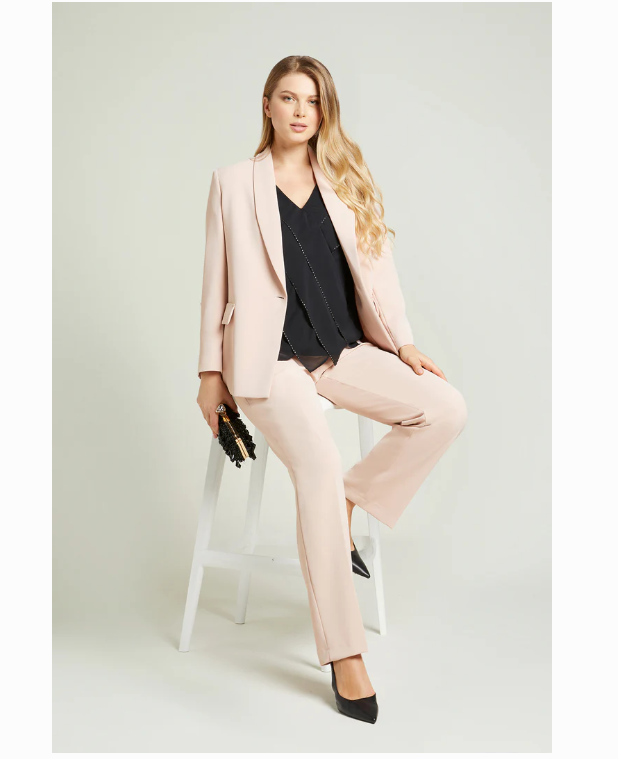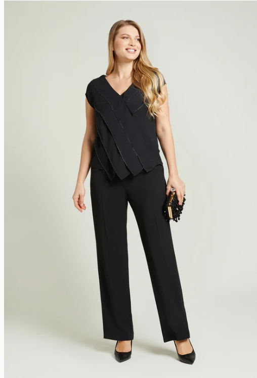 Top in georgette con scollo a “V”, caratterizzato da piccole balze asimmetriche impreziosite da punti luce. Foderato, manica corta.