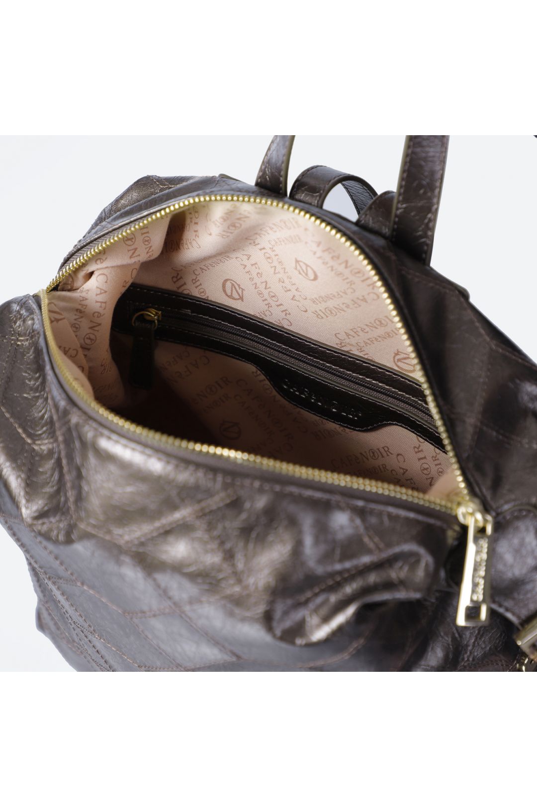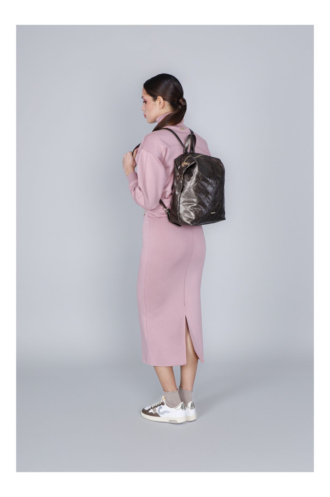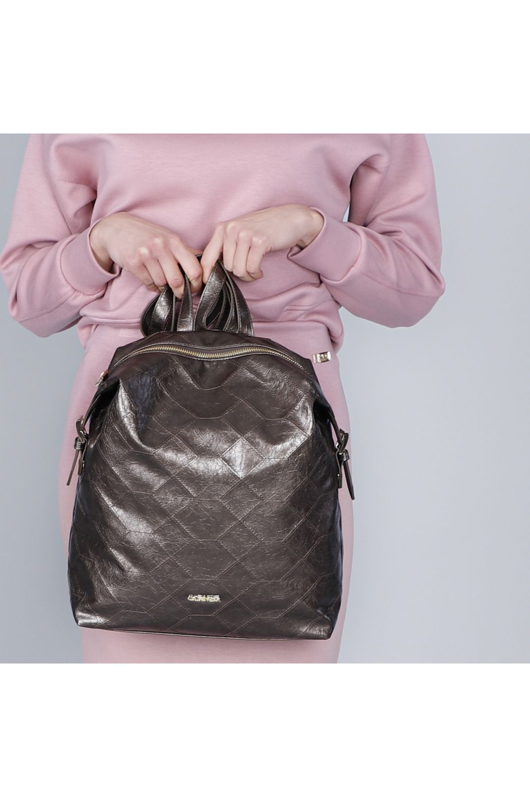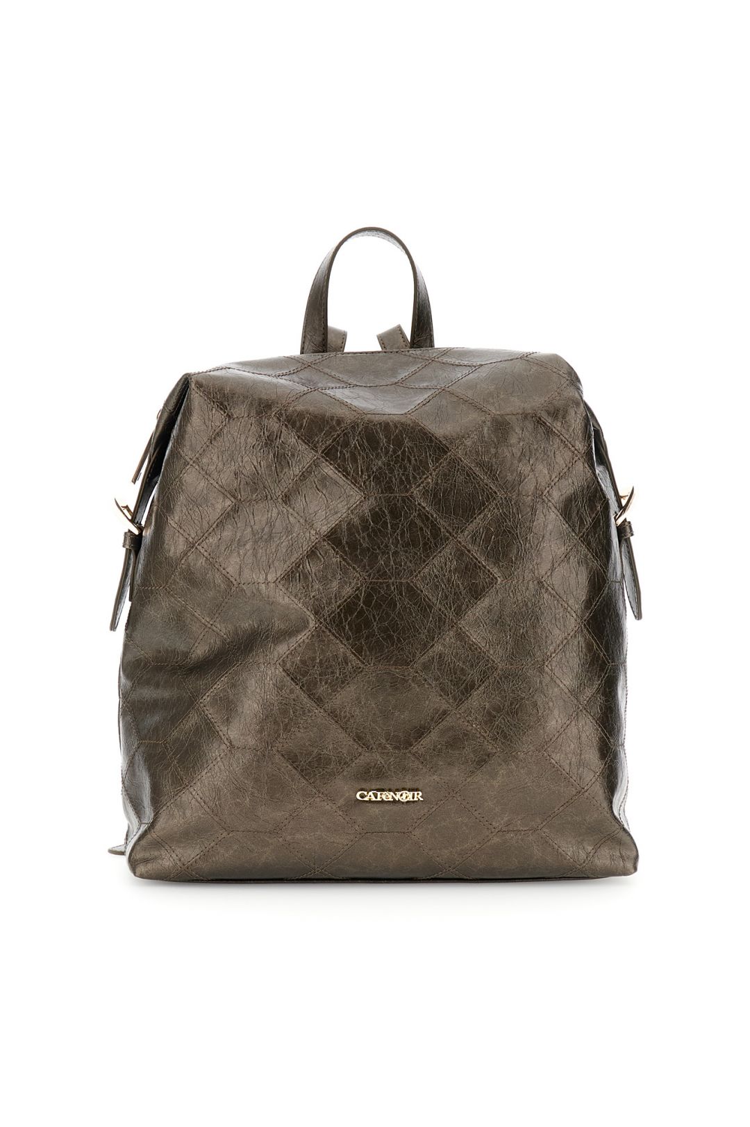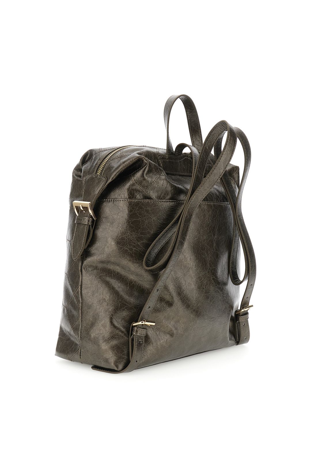 Zaino morbido in similpelle metallizzata con ricamo geometrico frontale tracolle regolabili tasca piatta sul retro e fibbie quadrate. lettering in metallo elegante.
